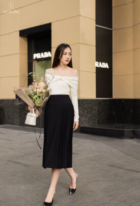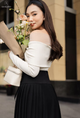 Thiết kế: dáng áo trễ vai phối vải lưới mềm mịn, mix cùng chân váy xếp ly trẻ trung, sang chảnh