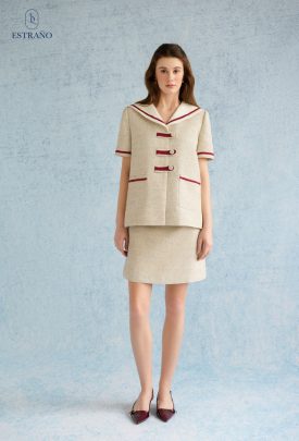 Một thiết kế mang hơi thở của những quý cô cổ điển, nhưng vẫn đủ tinh nghịch để làm mới mọi khoảnh khắc. Trên nền màu nâu muối tiêu lạ mắt, những đường viền đỏ chạy dọc như những nét vẽ đầy cảm hứng – một tổng thể vừa trang nhã, vừa khơi gợi sự vui tươi, hiện đại.