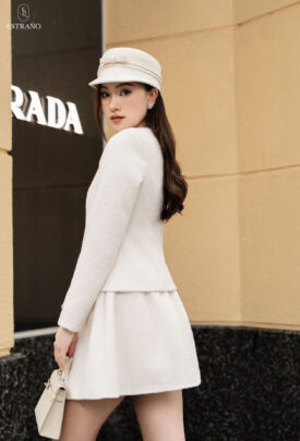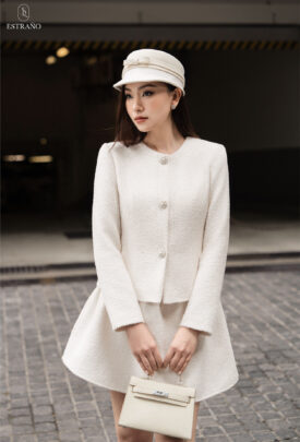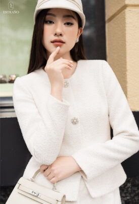 ✨Chất liệu: Thiết kế từ chất liệu dạ tweed Ý trắng ánh nhũ cao cấp, bên trong được lót thêm 1 lớp lụa ngọc mềm mịn mặc thoải mái và thấm hút tốt và lành tính cho da.